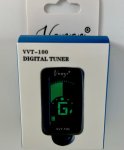VANGE DIGITAL CHROMATIC GUITAR TUNER. AVAILABLE IN EITHER VERTICAL OR HORIZONTAL ORIENTATION. CLIPS ONTO THE HEADSTOCK OF MOST INSTRUMENTS SUCH AS ACOUSTIC AND ELECTRIC GUITARS, BASS, UKULELE, VIOLIN, MANDOLIN, BANJO. VERTICAL ORIENTATION IS BEST FOR MOUNTING ON THE END OF THE HEADSTOCK. HORIZONTAL ORIENTATION IS BEST FOR MOUNTING ON THE LOWER SIDE OF THE HEADSTOCK. A QUICK PRESS OF THE BUTTON WILL CHANGE TO THE DIFFERENT INSTRUMENT MODES. WHEN IN GUITAR MODE THE DISPLAY TELLS YOU THE NOTE AND STRING NUMBER. LIKEWISE IT GIVES YOU THE NOTE AND STRING NUMBER FOR EACH INSTRUMENT YOU SELECT G (GUITAR), B (BASS), VIOLIN, UKUL (UKULELE). WHEN IN CHRO (CHROMATIC) MODE YOU CAN TUNE TO ANY NOTE. IN THE OTHER MODES YOU CAN BE SURE YOU ARE TUNING TO THE CORRECT OCTAVE FOR STANDARD TUNING ON YOUR INSTRUMENT. THE DISPLAY IS WHITE AND SHOWS YOU WHETHER YOU ARE HIGHER OR LOWER THAN THE CORRECT NOTE, IT WILL CHANGE TO GREEN WHEN YOU REACH THE CORRECT PITCH. IF THE BUTTON HASN'T BEEN PUSHED FOR 7 MINUTES IT WILL AUTOMATICALLY TURN OFF TO SAVE THE BATTERY. HOLDING THE BUTTON FOR 2 SECONDS WILL EITHER TURN THE TUNER ON OR OFF. USES A CR2032 BATTERY, INCLUDED.